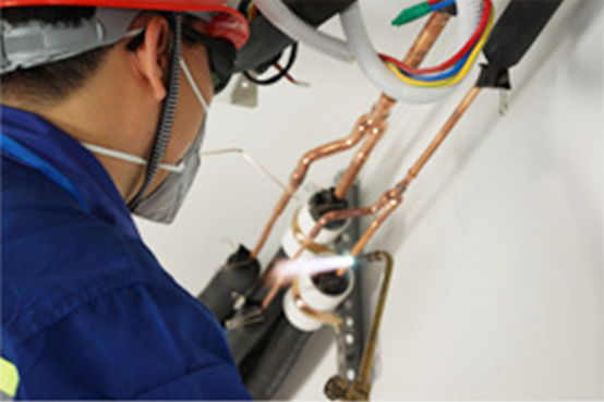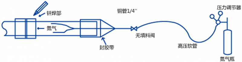 2.冷媒銅管安裝銅管橫平豎直布管,保證美觀。銅管安裝過程中應(yīng)重點(diǎn)注意以下幾點(diǎn):a.銅管存放和配管過程中必須保證封口,避免灰塵雜質(zhì)進(jìn)入;b.銅管焊接時(shí)必須持續(xù)充氮保護(hù),避免銅管內(nèi)壁產(chǎn)生氧化皮雜質(zhì);充氮壓力不需很大,微微有氣出來通過焊點(diǎn)即可;